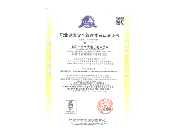 職業(yè)健康安全管理體系認(rèn)證證書(中文)